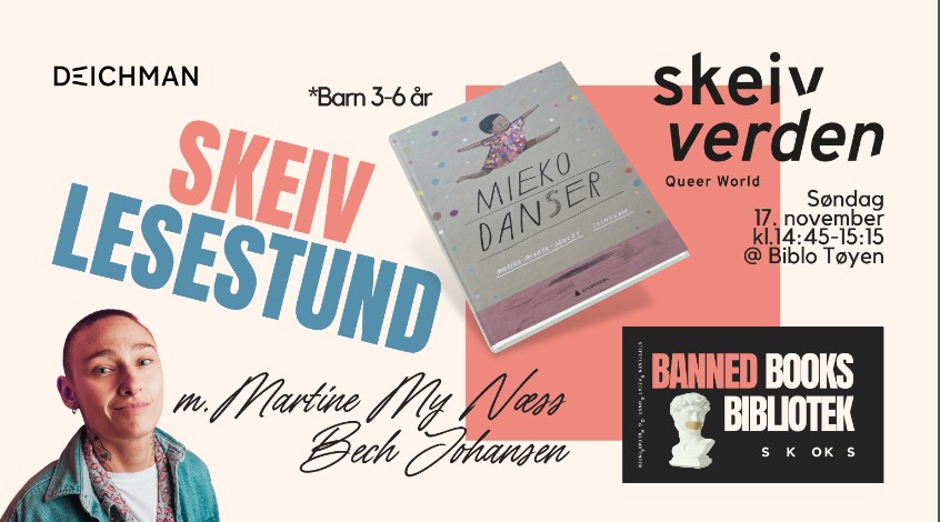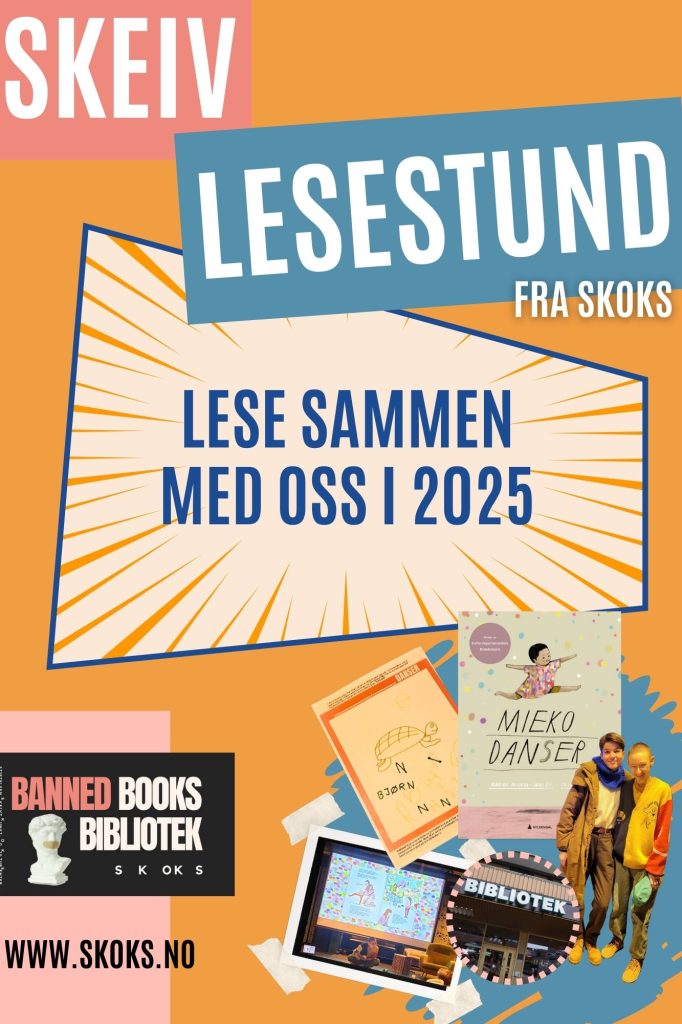Skeiv lesestund er del av Banned Books på SKOKS. I desember 2024 utvidet vi vårt skeive bibliotek m. en utstilling om bøker sensurert på grunnlag av rasisme/LHBTIQ-tematikk. Bøkene stilles ut med informasjon om utgivelsen, opprinnelsesland, tidsrom for sensur og hvor boken er sensurert, samt begrunnelser gitt for sensuren. Bøkene er også til utlån på stedet.
