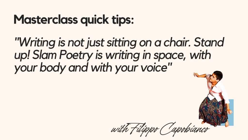 A unique and popular Masterclass by the Poetry Slam Italian Champion and World Champion 2023.