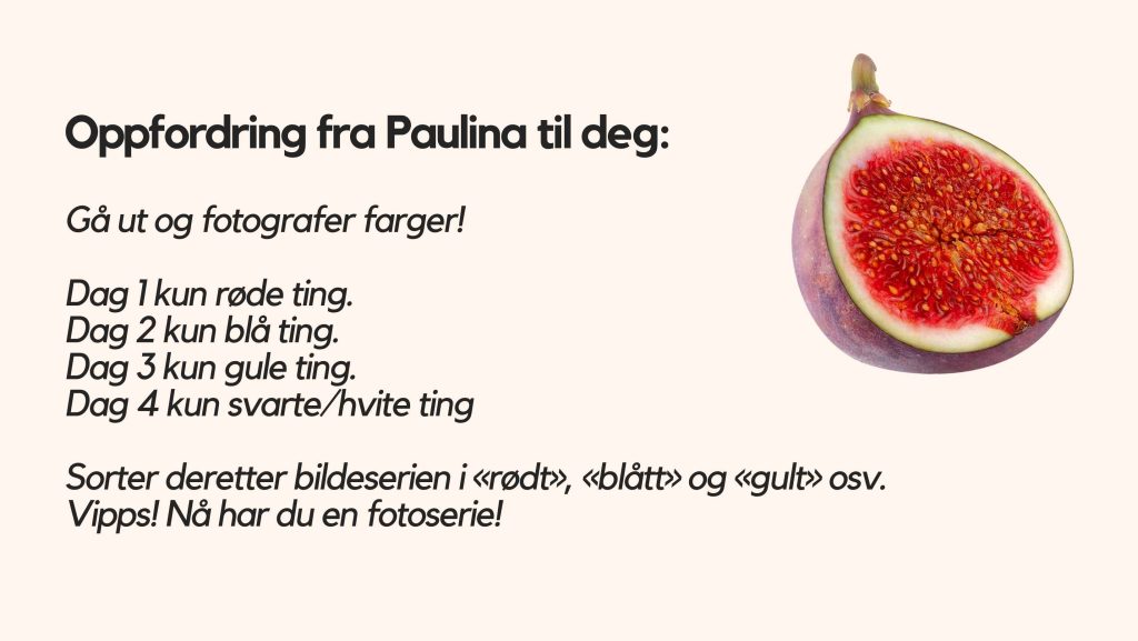 Deltakere tar på forhånd med et objekt som de vil tenke på som queer. Hva er spesielt med objektet? Deltakere får låne kamera av kursholder. Vi tar stilleben av frukt/objekter. Fototime: Vi ser etter queer spor!